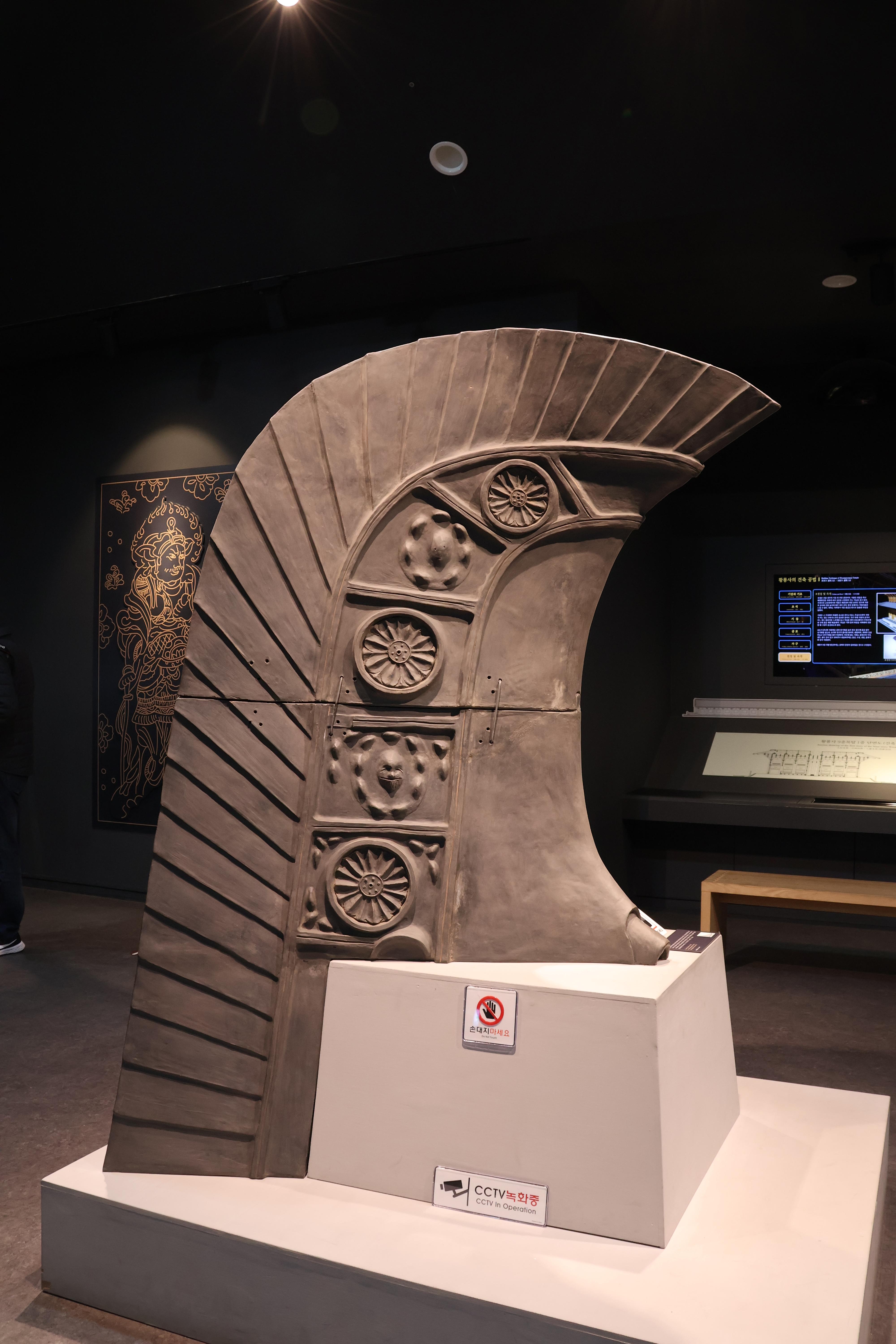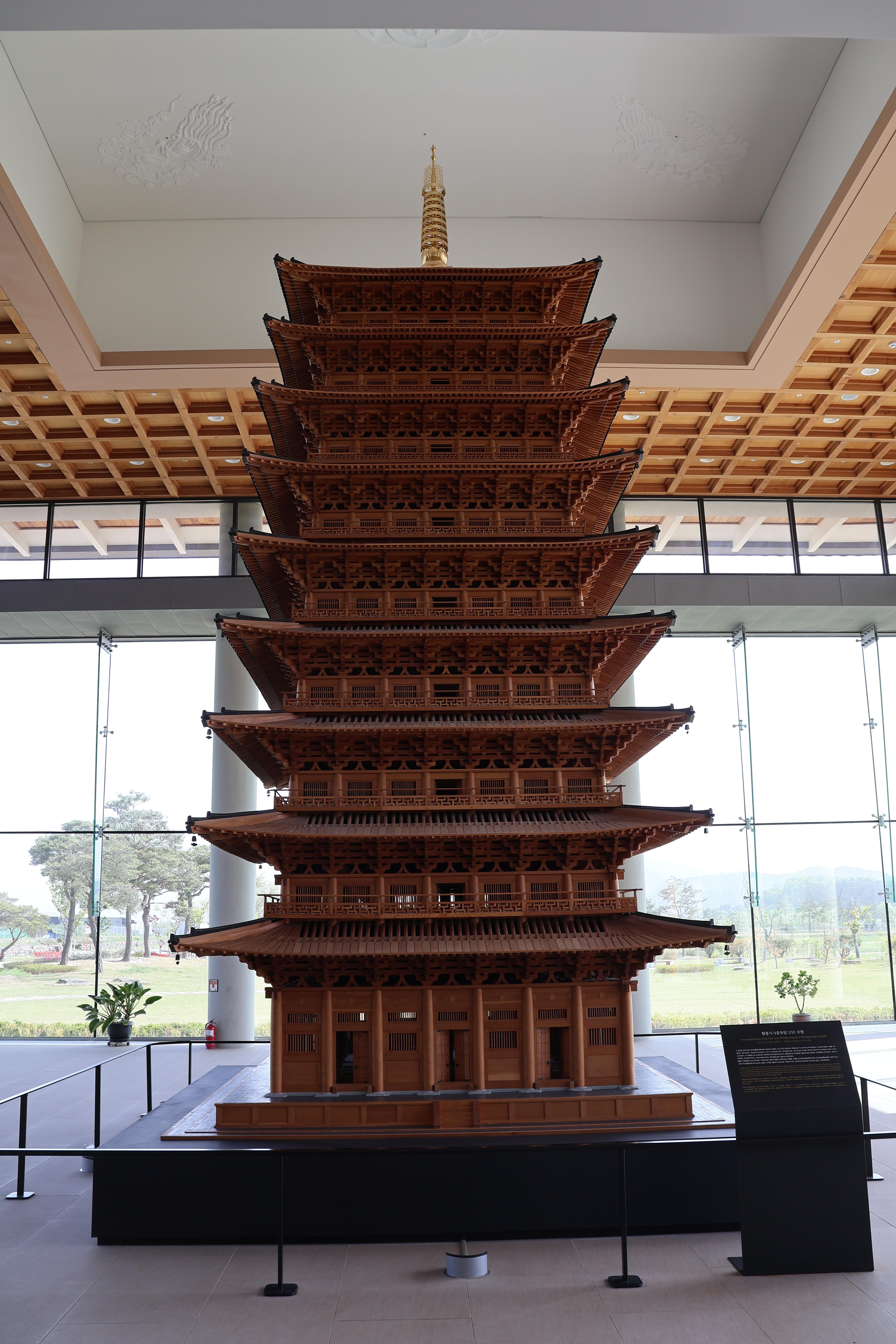 이 모형은 경주시에서 한국전통문화대학교에 의뢰하여 제작된 1/10 크기의 모형으로 전체 높이는 약 8m이며 내부구조를 볼 수 있도록 북측은 기와를 잇지 않았습니다. 모형 제작은 기본설계 및 실시설계, 1/20 크기 단면모형 제작, 구조안정성 검토, 3D BIM 설계 단계를 거첬으며 모형 연구 및 제작에는 8년의 기간이 소요되었습니다.